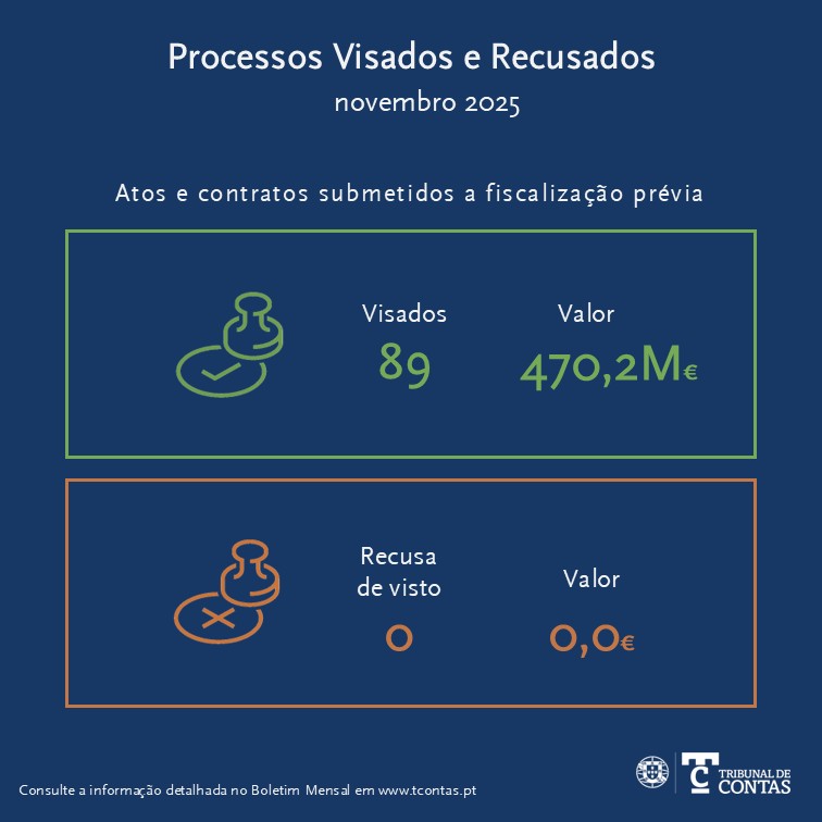 Em novembro, o Tribunal visou 89 atos e contratos, representando cerca de 470,2 milhões de euros, e não recusou o visto em nenhum processo. Neste mês, 7 processos registaram declaração de conformidade homologada, no montante de 18,2 milhões de euros.