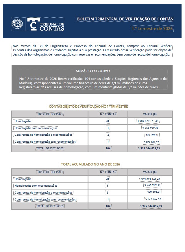 No primeiro trimestre de 2026 foram objeto de verificação pelo Tribunal de Contas 104 contas, correspondentes a um volume financeiro de cerca de 3,9 mil milhões de euros. Registaram-se três recusas de homologação, no valor de 6,2 milhões de euros.